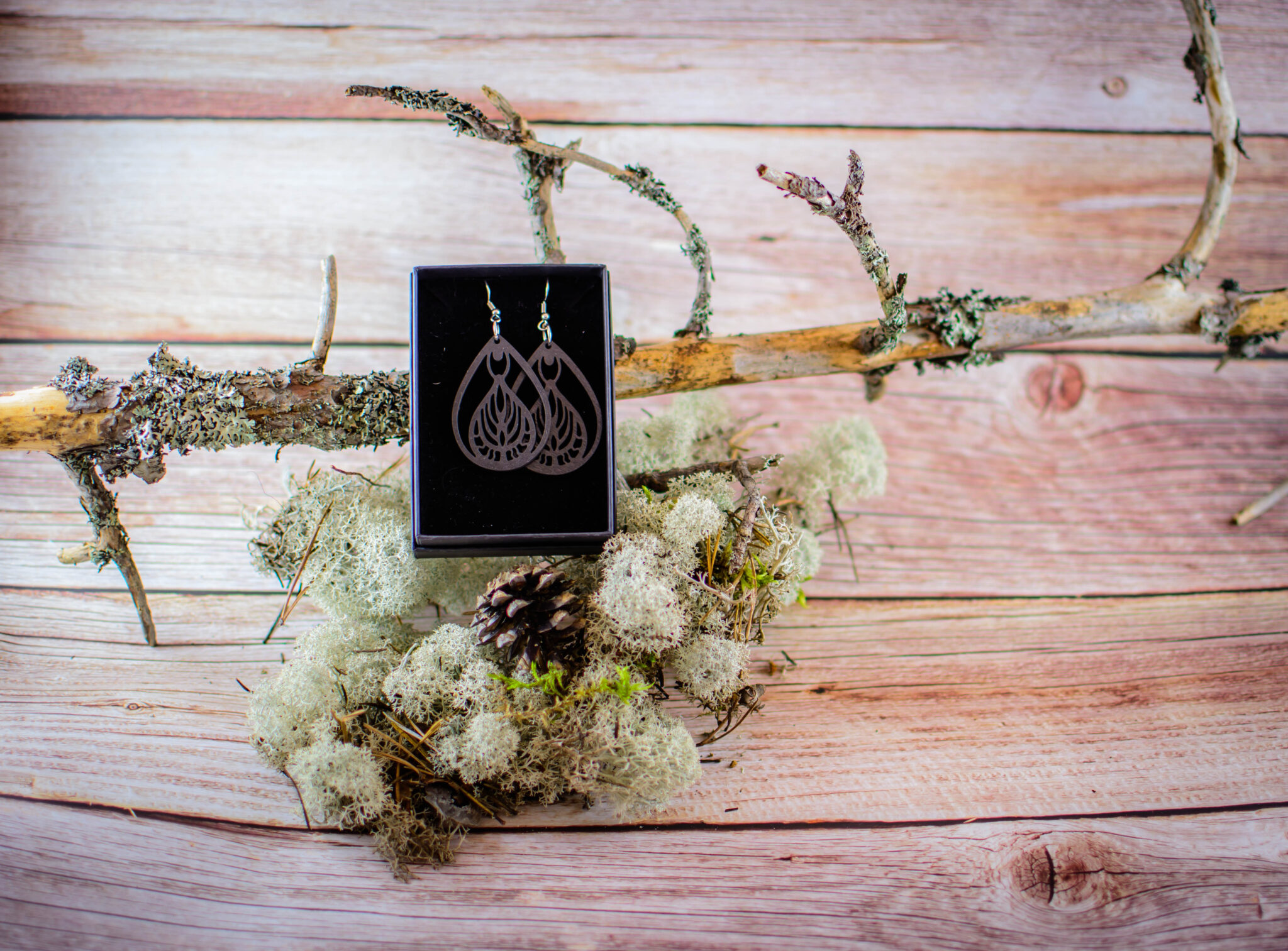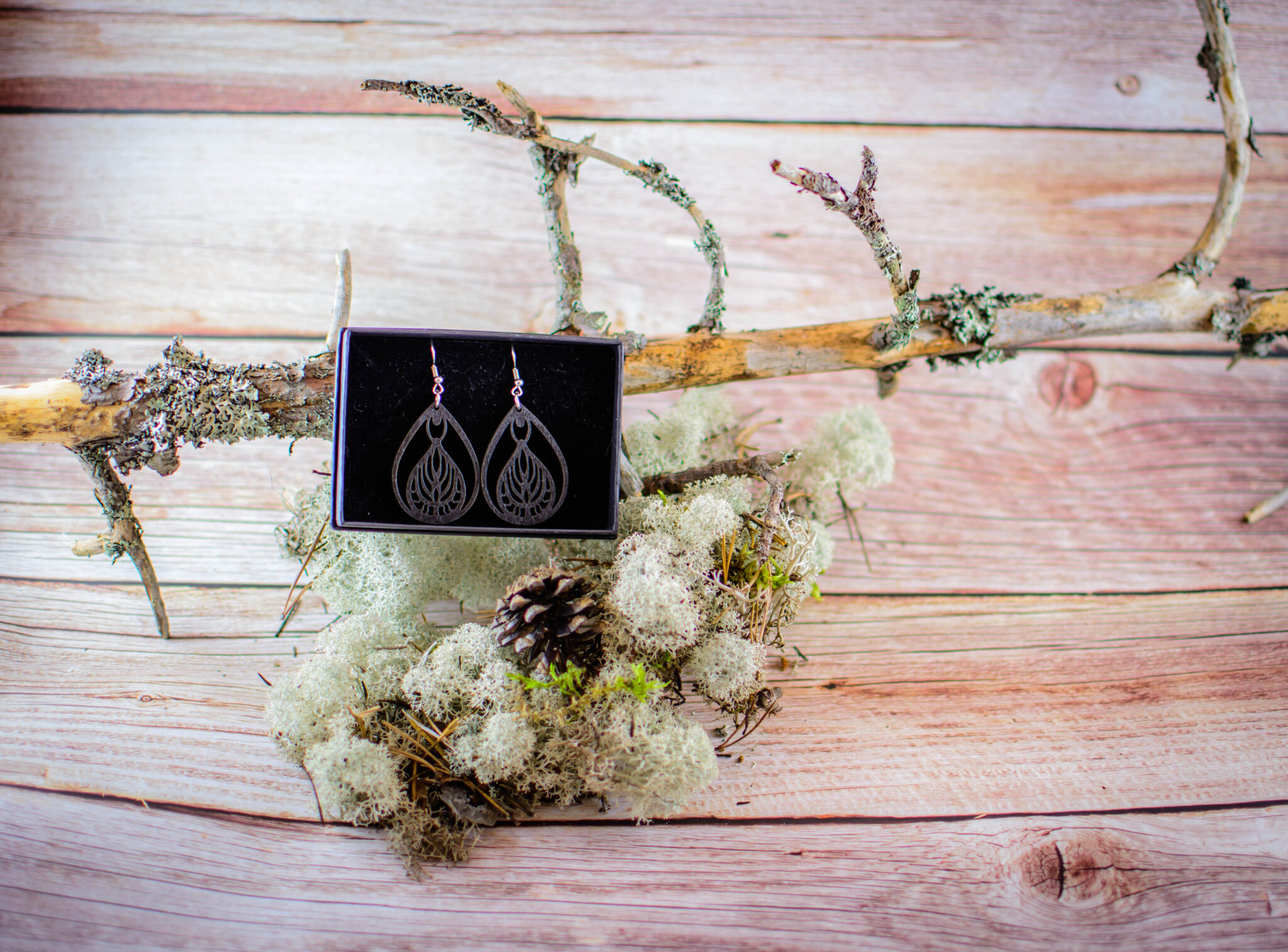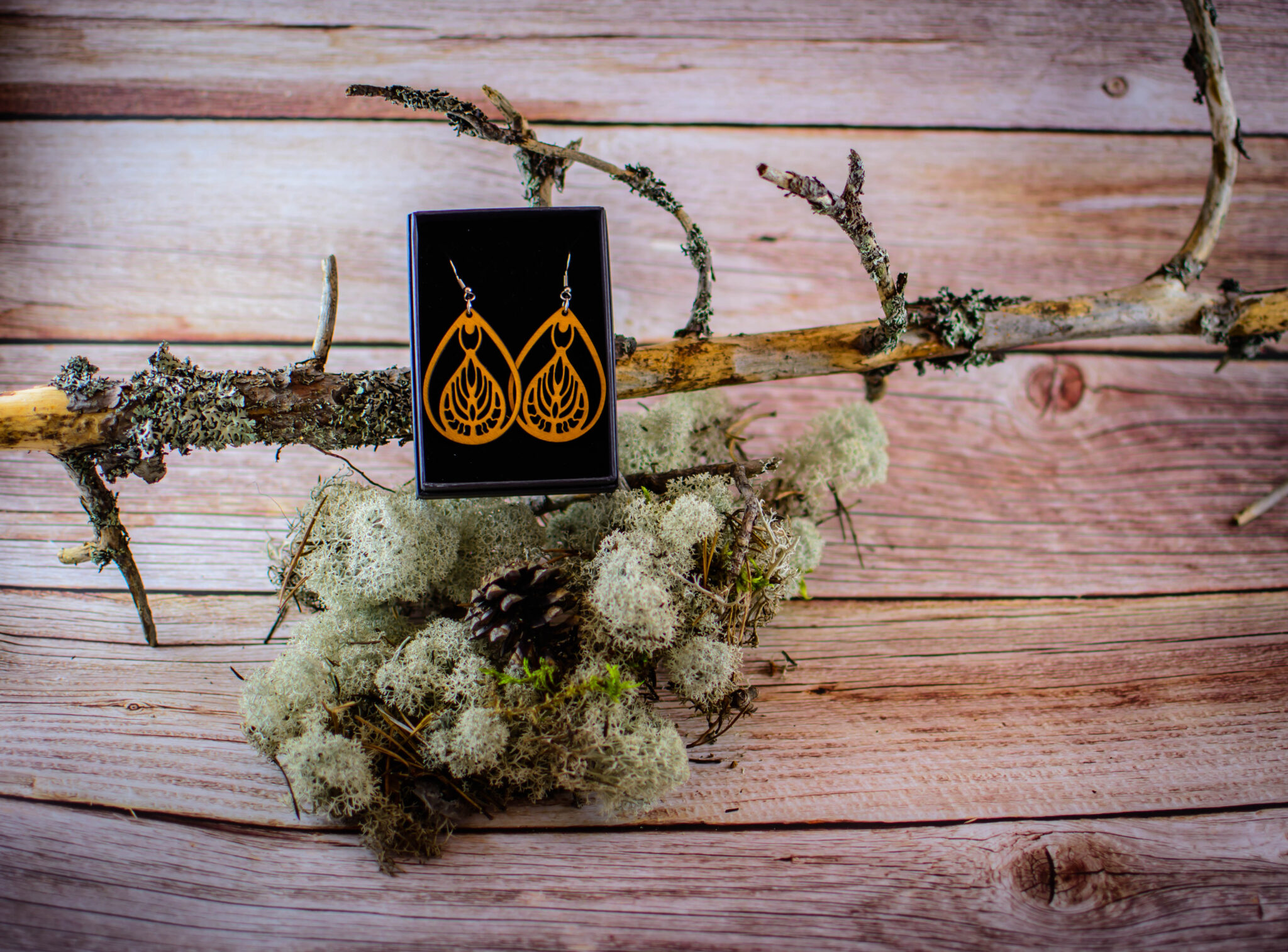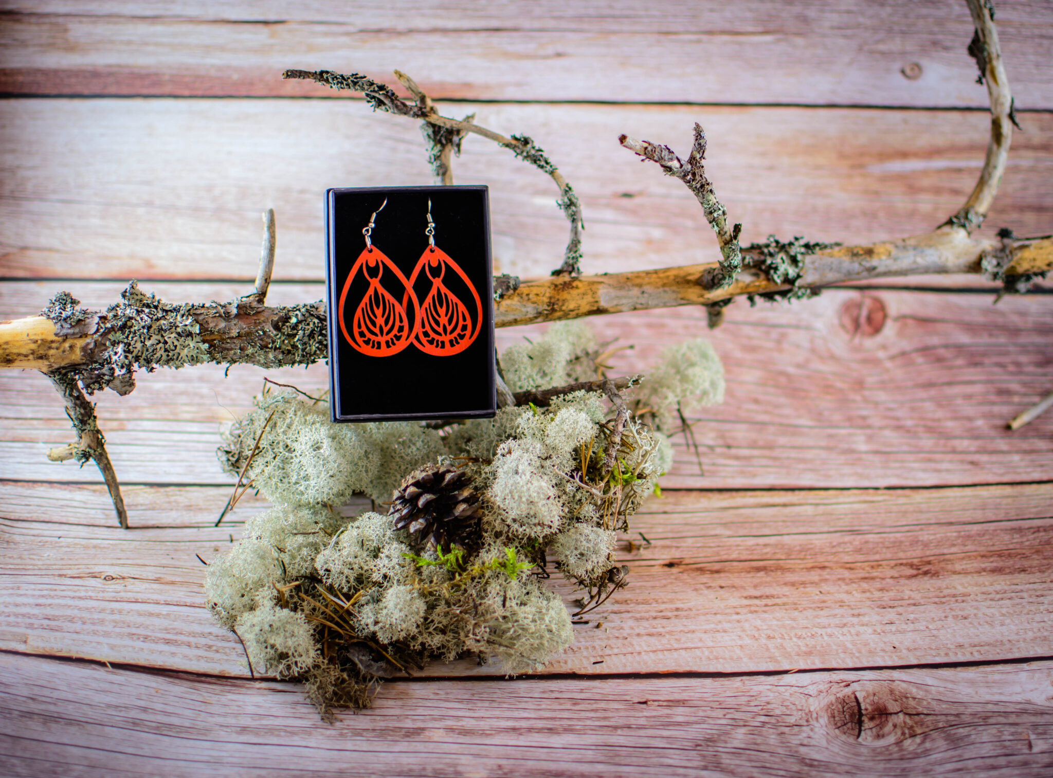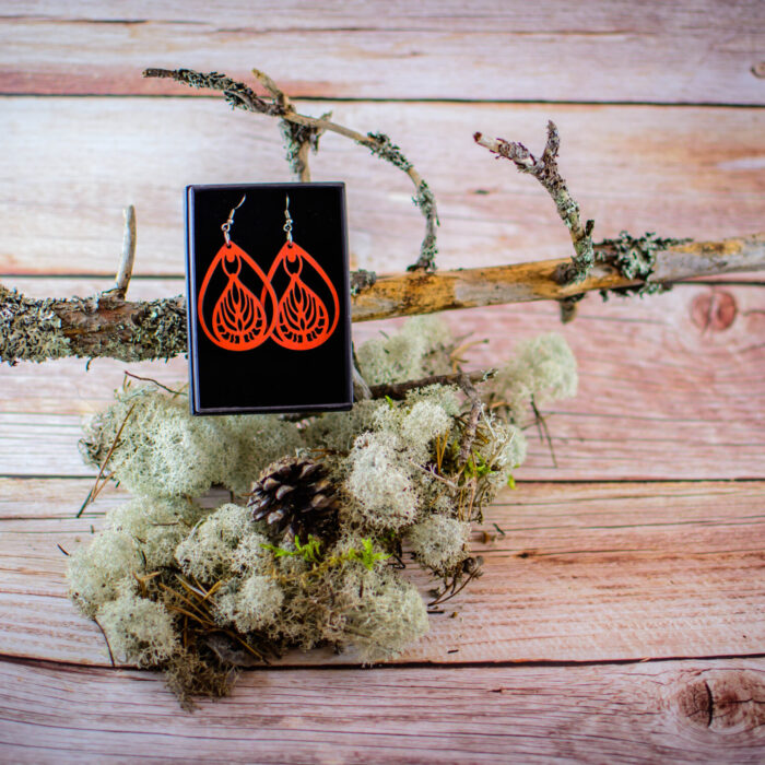 Tärkeää huomioitavaa on, että laserleikattujen korujen reunoissa näkyy polttojälki, mikä lisää tuotteeseen elävyyttä ja syvyyttä. Säilytä korut huolellisesti ja vältä voimakasta vääntelyä. Vaikka vanerista valmistetut tuotteet kestävät sadetta, suosittelemme välttämään niiden altistamista suihkulle, saunalle tai uimiselle. Huomaa myös, että värisävyt voivat hieman poiketa kuvassa näkyvistä väreistä, sillä ne ovat riippuvaisia omista väriasetuksistasi. Jokainen erä maalataan käsin, joten erien välillä voi pieniä eroja olla.