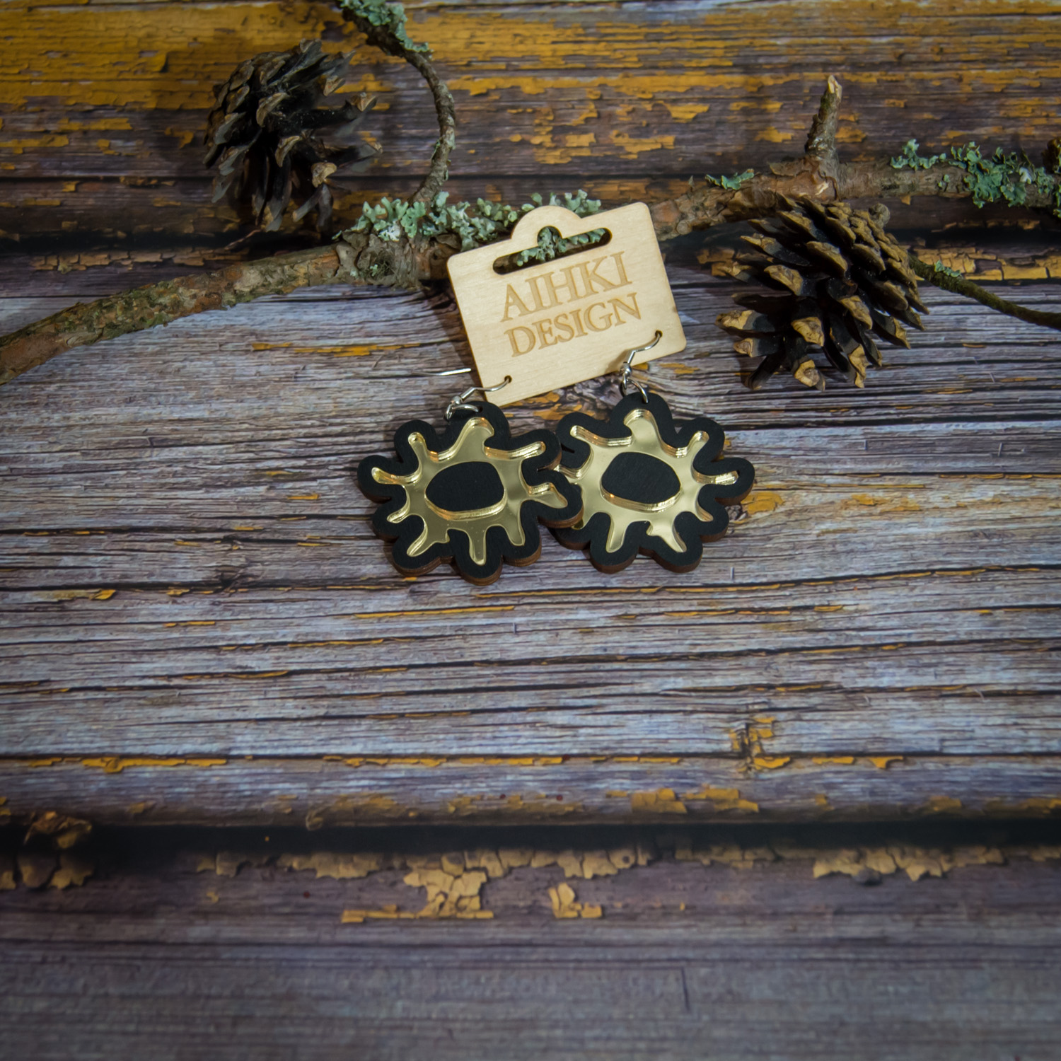 Tärkeää huomioitavaa on, että laserleikattujen korujen reunoissa näkyy polttojälki, mikä lisää tuotteeseen elävyyttä ja syvyyttä. Säilytä korut huolellisesti ja vältä voimakasta vääntelyä. Vaikka vanerista valmistetut tuotteet kestävät sadetta, suosittelemme välttämään niiden altistamista suihkulle, saunalle tai uimiselle. Huomaa myös, että värisävyt voivat hieman poiketa kuvassa näkyvistä väreistä, sillä ne ovat riippuvaisia omista väriasetuksistasi. Jokainen erä maalataan käsin, joten erien välillä voi pieniä eroja olla.