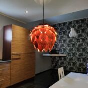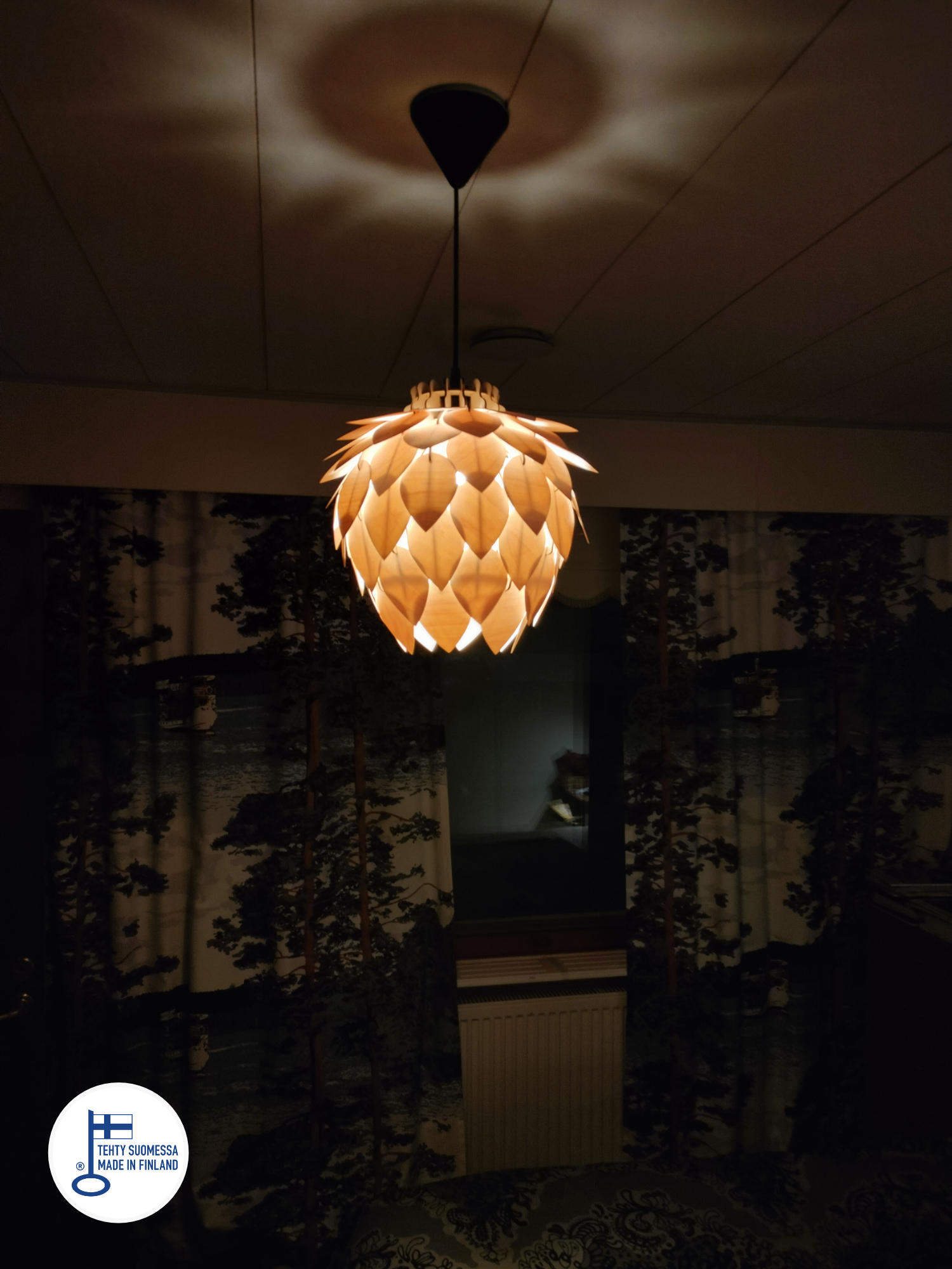 Tämä käsityönä valmistettu valaisin on tehty laadukkaasta kotimaisesta koivuvanerista, joka säteilee lämmintä ja kutsuvaa valoa ympärilleen. Sen elegantti muoto muistuttaa käpyä, yhdistäen perinteiset luonnonelementit moderniin designiin. Kajo on täydellinen valinta luomaan pohjoisen luonnon inspiroimaa tunnelmaa jokaiseen huoneeseen.