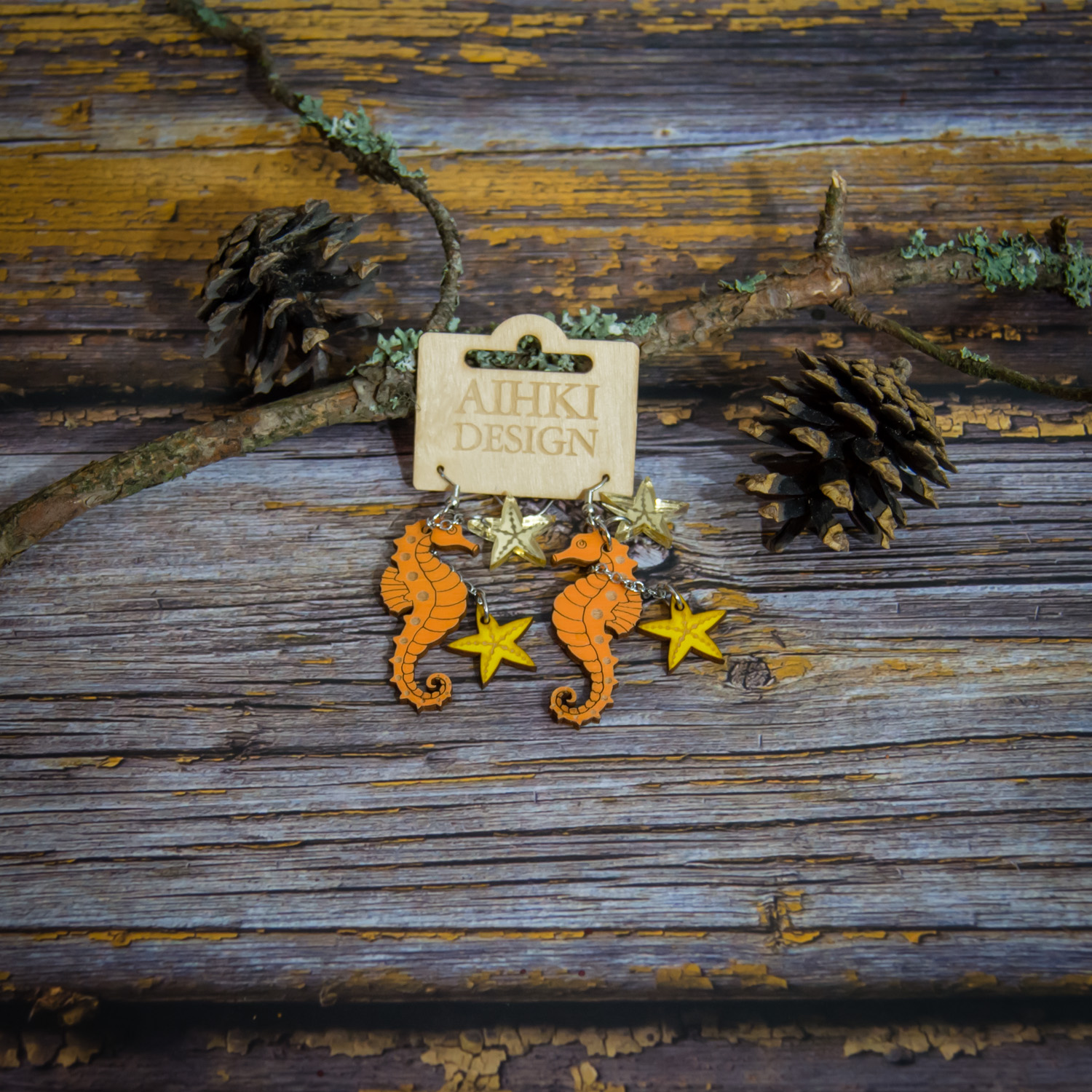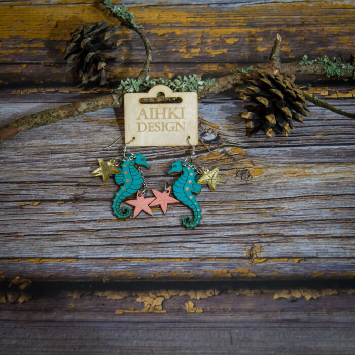 Merihevoset ja säihkyvät meritähtikoristeet tekevät näistä koruista iloisen katseenvangitsijan niin arkeen kuin juhlaan. merihevonen, pirteä kevyt korvakoru