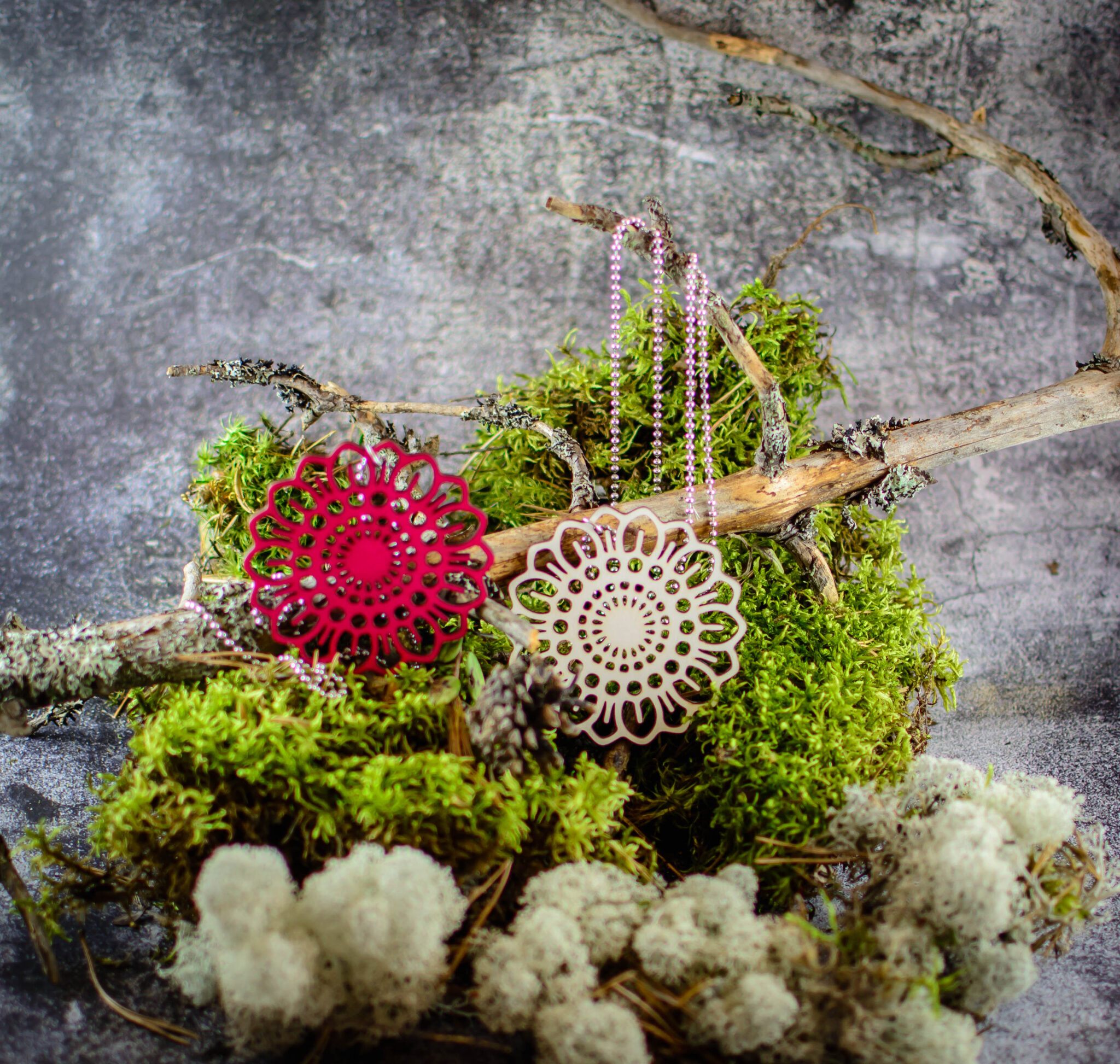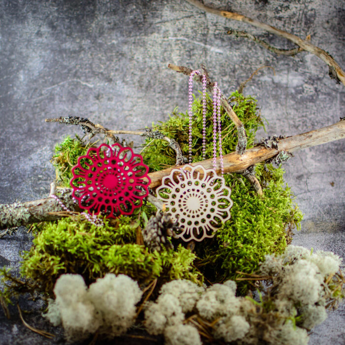 Tärkeää huomioitavaa on, että laserleikattujen korujen reunoissa näkyy polttojälki, mikä lisää tuotteeseen elävyyttä ja syvyyttä. Säilytä korut huolellisesti ja vältä voimakasta vääntelyä. Vaikka vanerista valmistetut tuotteet kestävät sadetta, suosittelemme välttämään niiden altistamista suihkulle, saunalle tai uimiselle. Huomaa myös, että värisävyt voivat hieman poiketa kuvassa näkyvistä väreistä, sillä ne ovat riippuvaisia omista väriasetuksistasi. Jokainen erä maalataan käsin, joten erien välillä voi pieniä eroja olla.