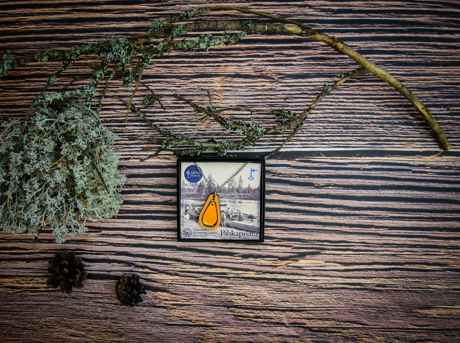 Pisaran sisään vangittu hehku symboloi pihkan voimaa – luonnon omaa suojaa, joka on kulkenut ihmisen mukana vuosituhansien ajan.
