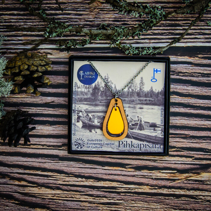 Pihkapisara-koru kantaa mukanaan metsän rauhaa ja pohjoista valoa. Sen muoto muistuttaa hitaasti valuvaa pihkaa: pehmeää, lämmintä ja elävää.