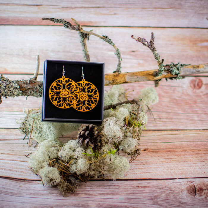 Tähtikukka korvakorut välittää puumateriaalin ainutlaatuisuuden ja käsityön arvostuksen kauniilla tavalla.