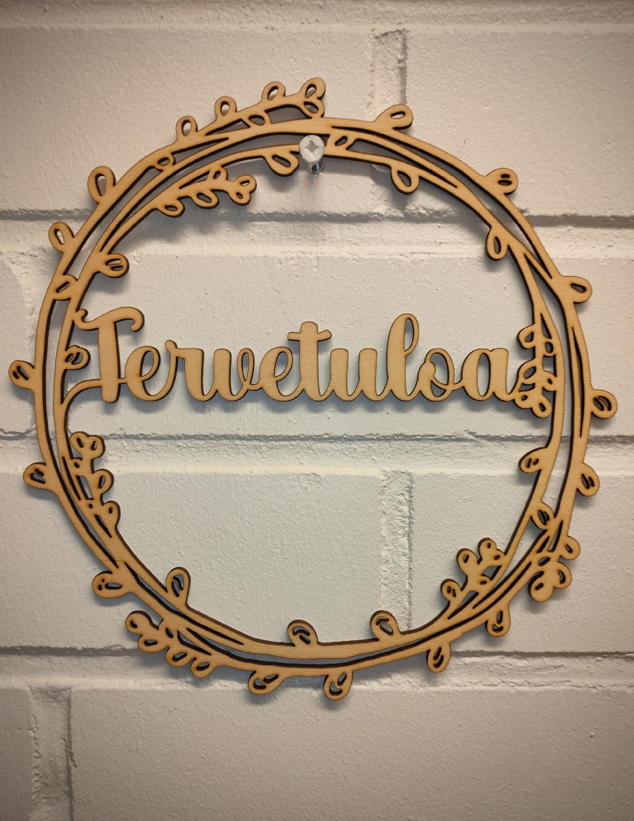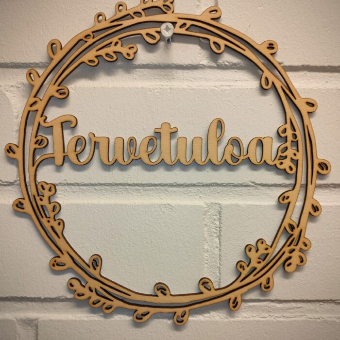 Tervapaju, hieno ja lämminhenkinen ovikoriste! kyltti on koristeltu pajunoksien tyylisillä koukeroilla, jotka muistuttavat pajunkissoja, keväinen suomalainen